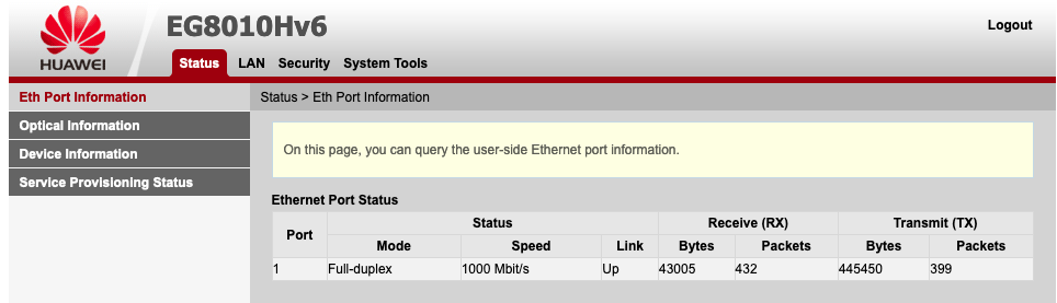 Dit is overigens een andere reden waarom ik de ONT blijf gebruiken en niet met een SFP aan de gang ga, als er kwaliteitsissues zijn met de verbinding dan is het zo dat beide einden van de verbinding geleverd zijn door Freedom / Fiber Operator en er geen discussie ontstaat over mijn apparatuur. Je kunt ook de ethernetpoort van de ONT opvragen. Ik let dan op 1000 Mbit/s en Full-Duplex. Als je slechts 100 Mbit/s krijgt dan heb je waarschijnlijk een kapotte netwerk-kabel of heel mss een Fritz die geen gigabit verbinding aankan (dit is soms iets wat je in kan stellen). Let op dat de oude NTU’s alleen 1000 Mbit/s aankonden dus als je upgraded is de kans dat dit misgaat niet zo groot.