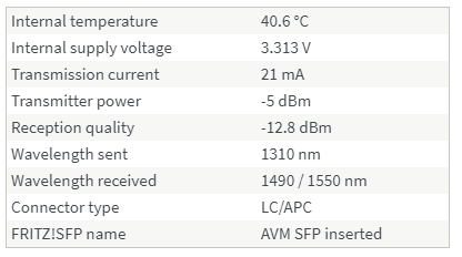 Als je de reception quality vergelijkt met de transmitted power is dat 7dB minder, wat een vermogens verlies van ongeveer een factor 5x zou betekenen in de fiber, aannemende dat de transmitted power op beide uiteinden gelijk is. En een factor 5x verlies, inclusief in en uitkoppeling in een fiber is best wel goed.