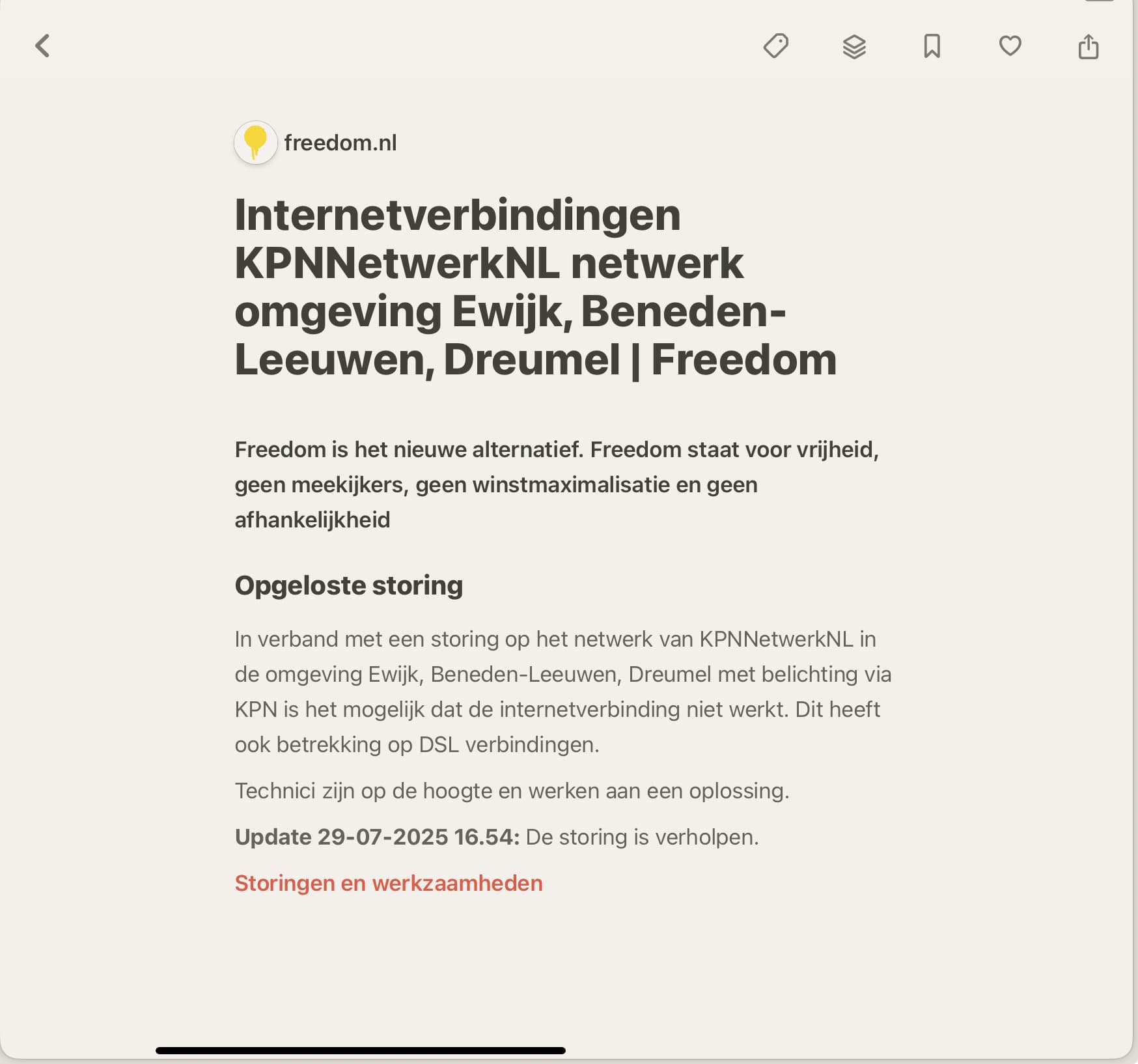 De opgeloste storingen staan onder het uitklapbare menu ‘historie’ op de pagina en daar verdwijnen de recent gesloten storingen naartoe. ![]()