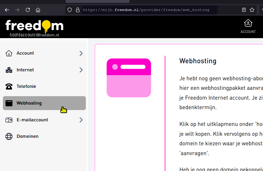 meteen de keuze WebHosting moeten zien (zie afb. URL-pad is dan https:// Mijn.Freedom.NL / provider / freedom / web_hosting )